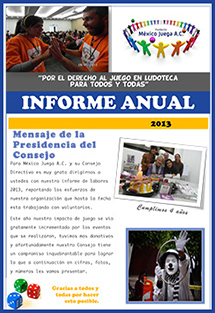 En Fundación México Juega A.C., sabemos la importancia que tiene el tema de la transparencia y la rendición de cuentas a la sociedad en general, y de manera particular, a quienes con gusto colaboran con nuestra misión año con año. Es por ello que este espacio está dedicado a presentar nuestros informes anuales; en ellos encontrarás las principales acciones que realizamos –cursos, talleres, presentaciones–, quiénes fueron nuestros donantes y voluntarios, así como los principales retos que afrontamos y los desafíos que vislumbramos.
